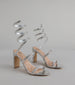She’s glam, she’s bold, she wraps you in sparkle—literally. These spiral strap block heels are made for main stage moments, with rhinestone embellishments and a metallic finish.