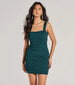 A glitter mini dress boasts a flattering open back with a flirty tie design and side ruched seams accentuating your curves along the bodycon fit. Perfect for the school dance or a party.