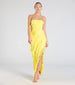 A showstopping lace formal dress that exudes romance and modern elegance. Designed with a high strapless neckline, this long dress boasts a bodycon silhouette with flirty cascading ruffles and a sultry high-side slit. Complete the look with earrings and heels.