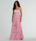 You'll look adorably elegant in the Liliane garden rose ruffled A-line formal dress as a striking bridesmaid, wedding guest, or at a daytime soiree! Delicately printed with garden roses on a mesh fabric, this gown is a work of art. Her strapless neckline and ruched bodice offer a secure and flattering fit, while the ruffled A-line silhouette and floor-length hem exude elegance and add a hint of drama. Complete the look in strappy heel sandals and earrings.