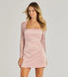 Create a chic and sleek party look in the Liora formal mini dress designed with smooth satin woven fabric and sheer lace long fitted sleeves for a touch of allure. It features a square neckline with a padded bust for support, an open back with a lace-up design for a customized fit, and a short A-line silhouette.