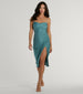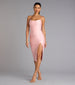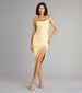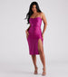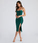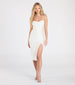 Simple and sleek, this smooth knit midi dress is a perfect choice. It features a sleeveless cowl neckline, spaghetti straps, a high waist seam, a form-hugging silhouette, and a chic high front slit to showcase some leg.