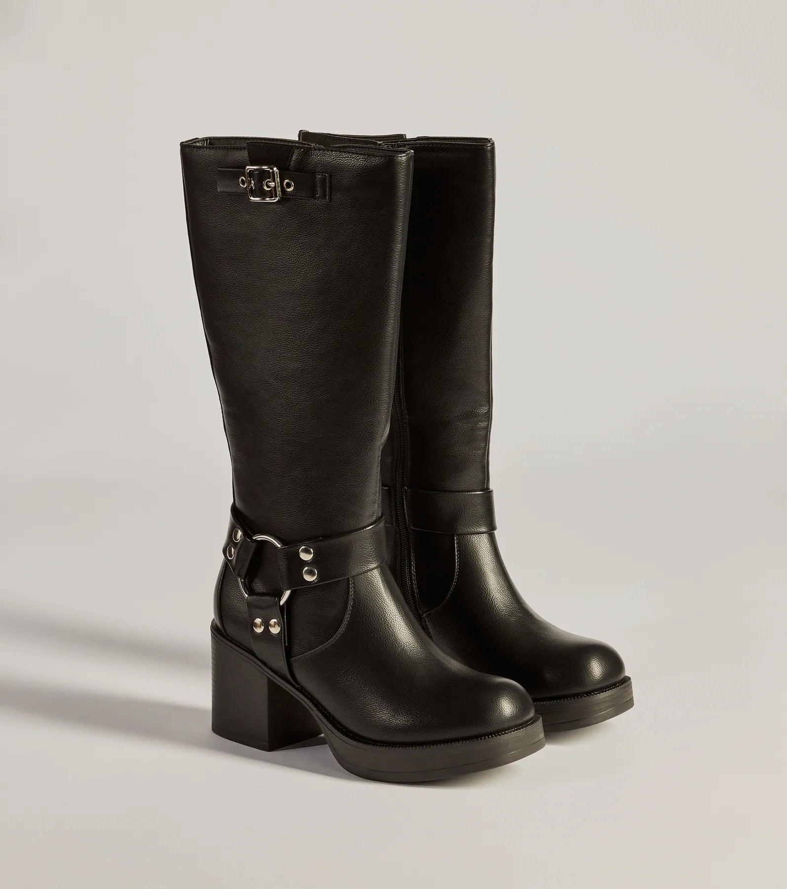 Show off a sleek strut in these edgy under-the-knee moto boots featuring a stacked block heel, buckle strap accent, and inner zipper closure.
