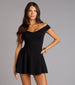 The little black dress, upgraded—this off-the-shoulder mini dress brings flirty flair with a sweetheart neckline and playful skater silhouette. Perfect for everything from date nights to nights out with the girls.
