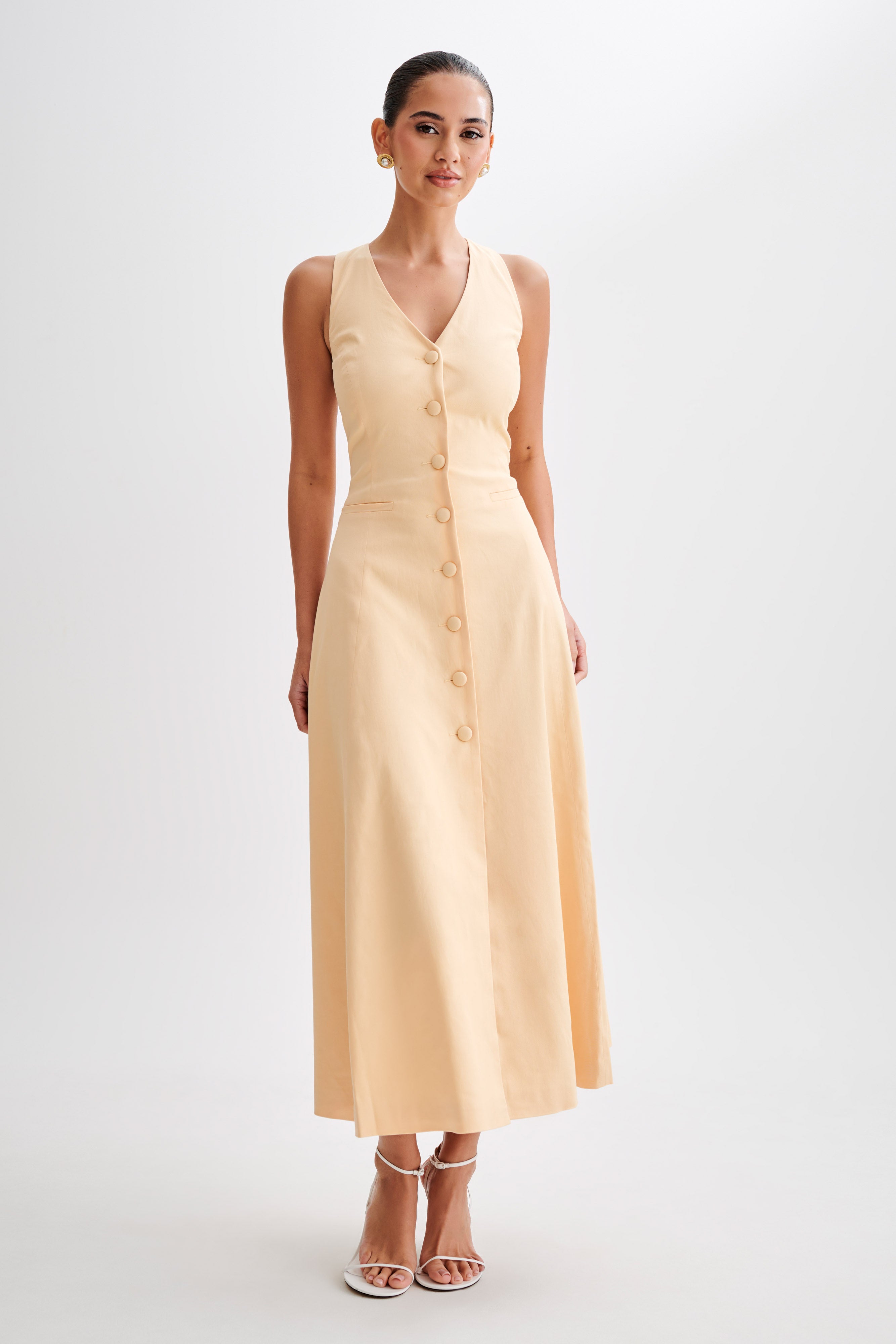 The THEODORA Cotton Buttoned Midi Dress epitomises timeless elegance and comfort. With its graceful V neckline and functional centre front button closure, this dress exudes understated charm. Its A-line skirt shape flatters every figure, while the sleeveless design offers versatility for layering or wearing alone. With a chic midi length, this dress transitions seamlessly from day to night, making it a wardrobe essential for the modern woman who values both style and practicality.